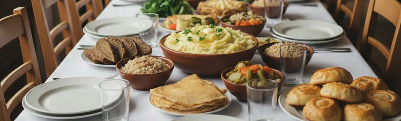 Если вы собираетесь провести поминки во время поста, помните, что пища животного происхождения запрещена. На стол можно ставить только блюда без мяса (любого, то есть курицу и другую птицу есть нельзя), яиц, сметаны, кефира и молока. Колбасные нарезки тоже недопустимы. Подойдут овощные супы (или из грибов), квашеная капуста, соленья, салаты из зелени, разные каши, картошка и другие приготовленные овощи. В некоторые дни разрешаются морепродукты или рыба (нужно проверить церковный календарь). Тесто для выпечных изделий готовится исключительно на воде, внутрь кладут овощные или сладкие начинки.
